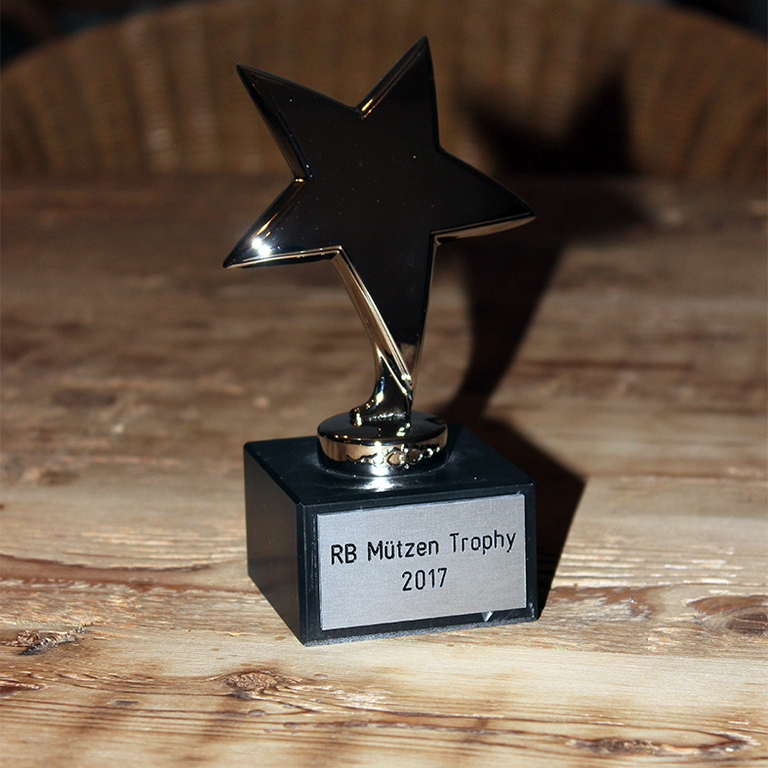 Der Sieger erhält den wertvollen Pokal mit Gravur "RB MÜTZEN TROPHY 2018", den wir stiften und im Januar in lustiger Runde überreichen.