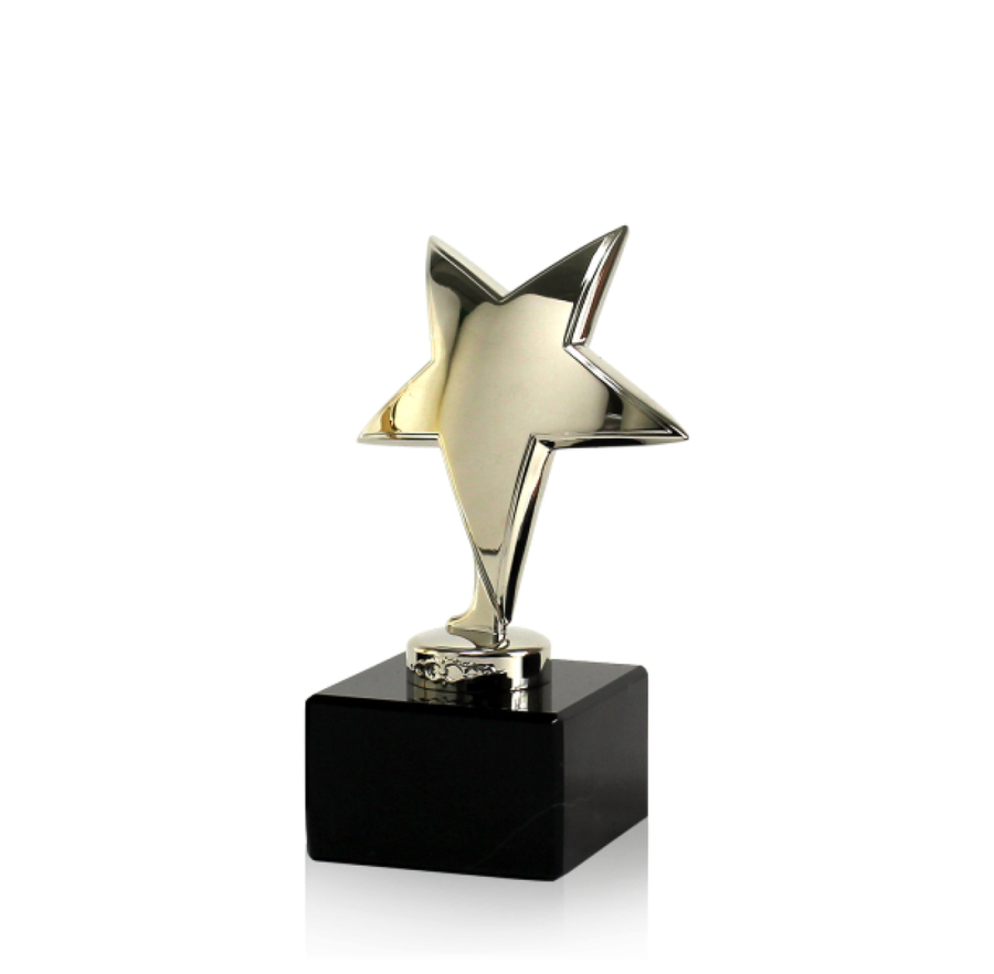 Diese Stern-Figur ist eine ganz besondere Auszeichnung für einen ganz besonderen Menschen. Der Pokal besteht aus einer originellen Figur in der Form eines fünfzackigen Sterns. Dieser Metallstern erstrahlt in einer silberfarbenen Gestaltung und versprüht dabei glanzvollen Charme. Die Figur an sich hat eine Höhe von 10,5 cm und steht auf einem edlen Marmor-Sockel. Die Gesamthöhe beträgt hier 14,5 cm.